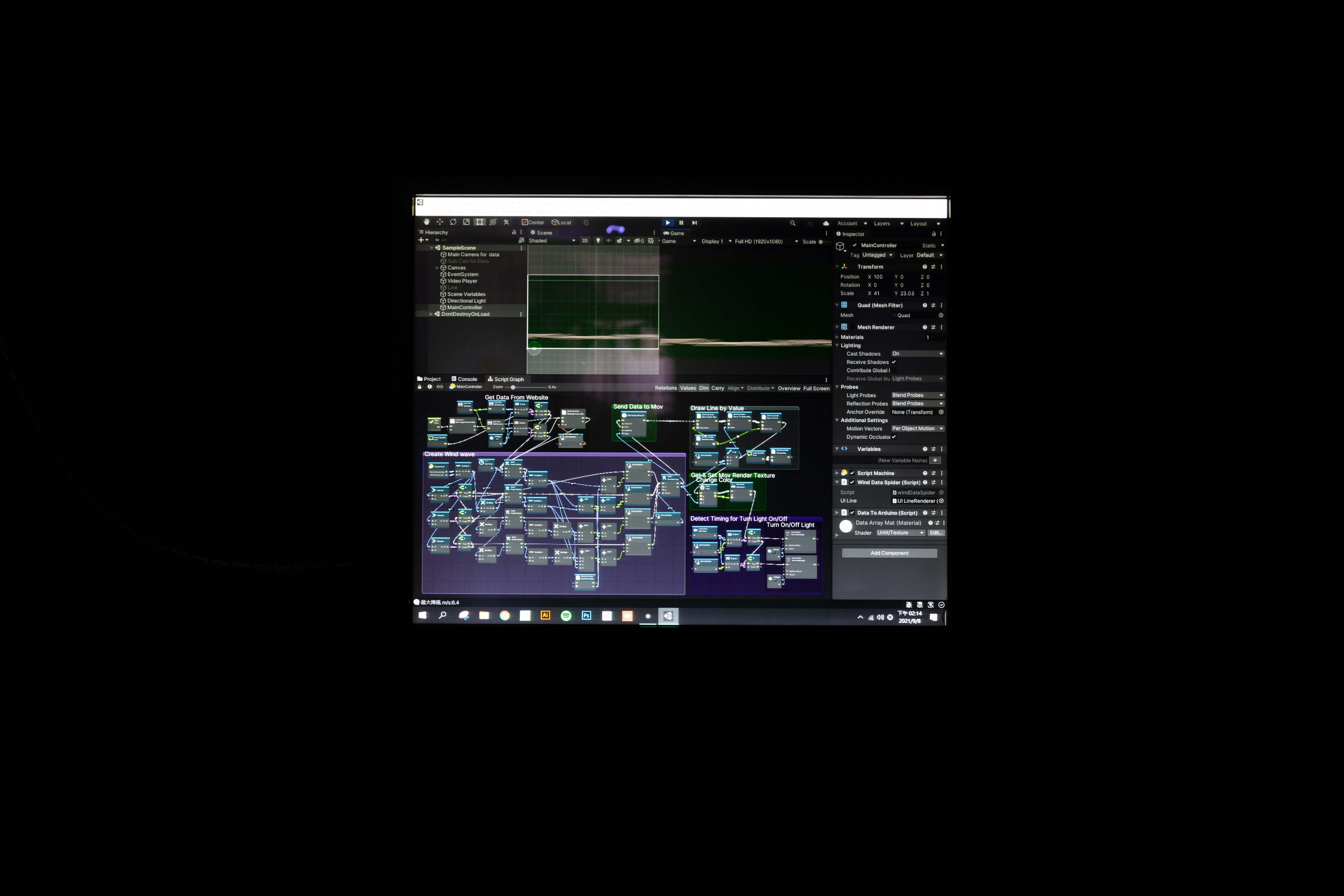 The piece, is of three components: video, data, and light installations. The voice-over is a legend about why Taiwan's indigenous peoples came to the island. In this work, I aimed to reflect the narrative through data and lighting installations. By capturing real-time wind data from the story's mountain and integrating it into the video through programming, I tried to establish a connection with that place and evoke the presence of the imperceptible, much like the air. The lighting installation in the video is a composite symbolizing betel nuts and mythical monsters. Its green light may induce visual hallucinations, allowing viewers to see a nonexistent magenta color. The “temporary space”.