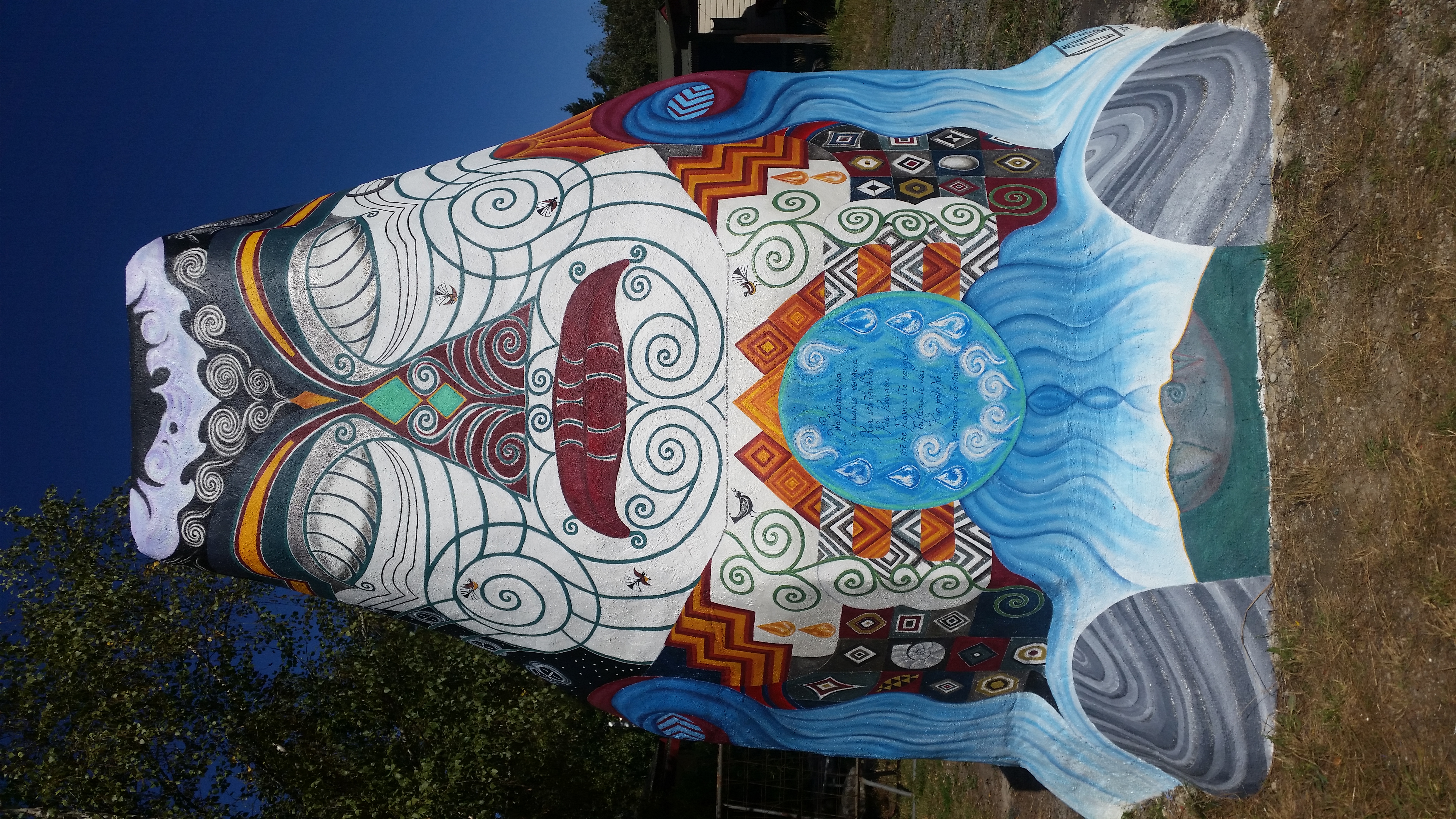 EN_ This chimney tells the story of Tongariro, the sacred volcano and ancestor of the people of the Taupo area, on New Zealand’s North Island. Legend has it that Tongariro fought all the other volcanoes to win the love of Pihanga. He gazes at her, seeing all his love reflected in the lake. Here, Tongariro appears sleepy, dreaming within a large white cloud. He is adorned with all elements of nature, with crystal water drops cascading from his shoulders and hands. His emerald lakes rest on his nose, while he holds his blue lake on his chest, conveying a message of freedom, creativity, and love. On the opposite side, the front of the chimney depicts Ruaumoko, the god of earthquakes and volcanic eruptions.