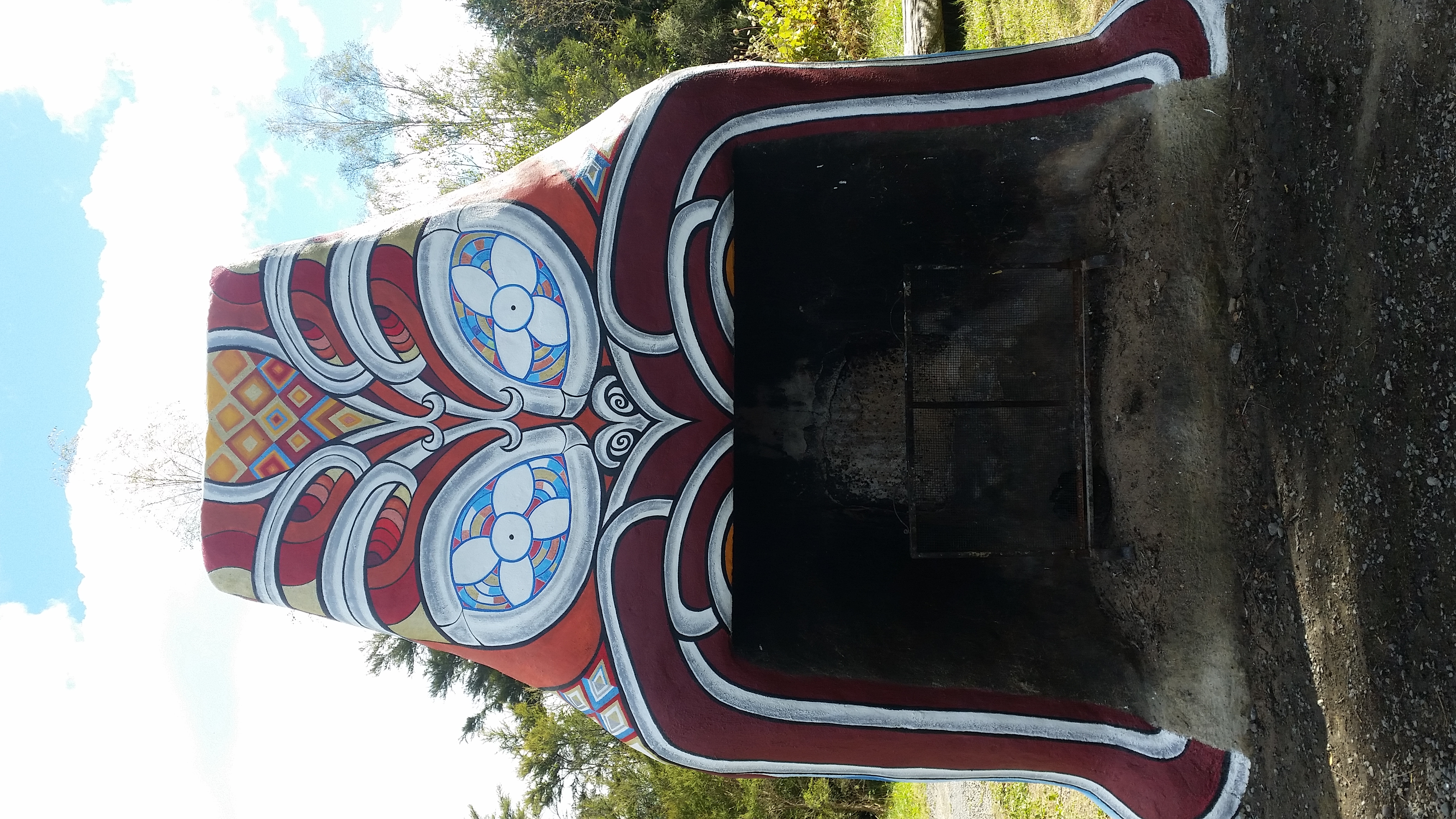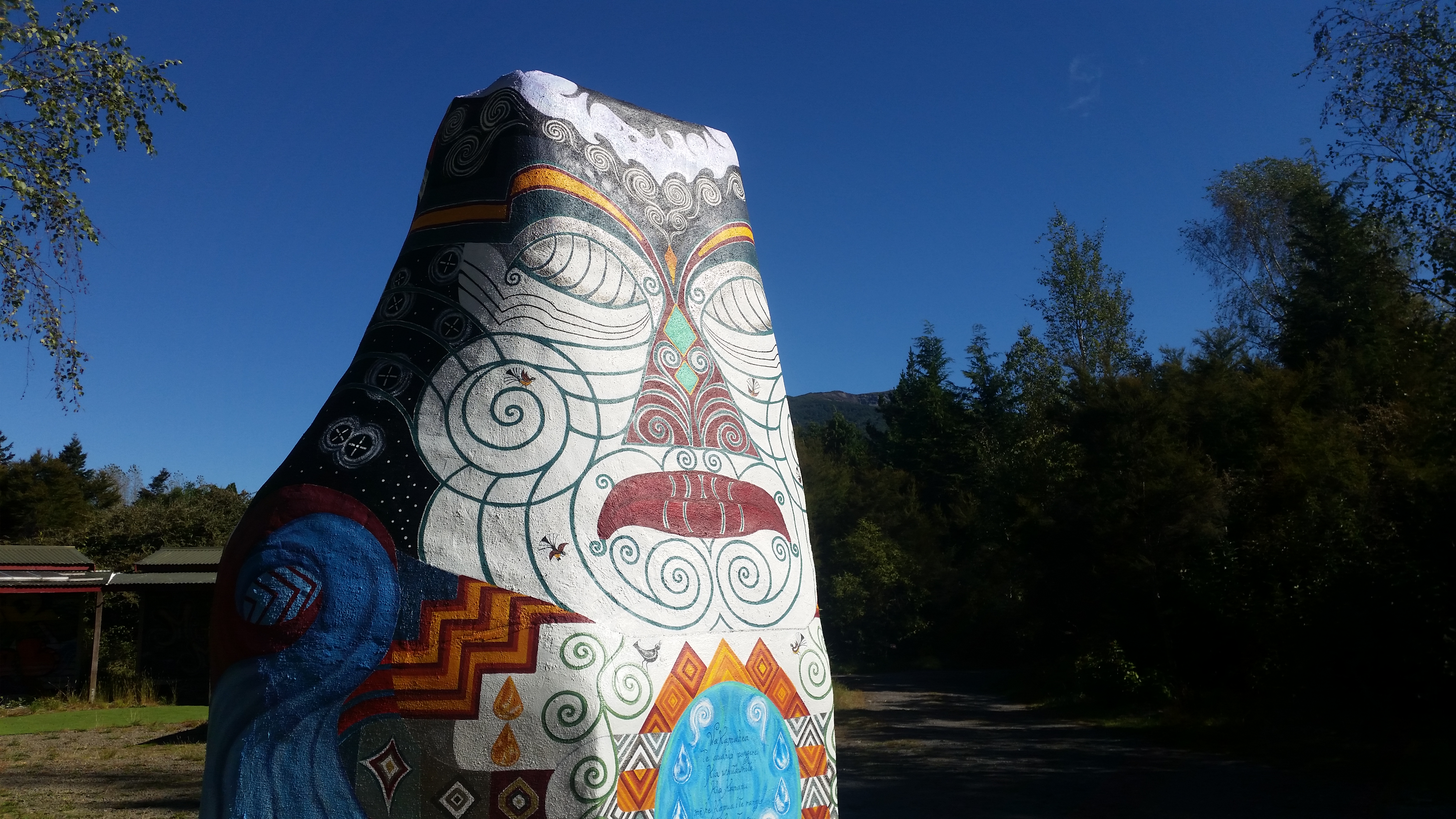 IT_ Questo camino racconta la storia di Tongariro, il sacro vulcano e antenato del popolo della zona di Taupo, nell’Isola del Nord della Nuova Zelanda. La leggenda narra che Tongariro combatté tutti gli altri vulcani per conquistare l’amore di Pihanga. Egli la osserva, vedendo tutto il suo amore riflesso nel lago. Qui Tongariro appare assonnato, sognando dentro una grande nuvola bianca. È adornato con tutti gli elementi della natura, con gocce di acqua cristallina che scendono dalle spalle e dalle mani. I suoi laghi smeraldo riposano sul naso, mentre custodisce il lago blu sul petto, trasmettendo un messaggio di libertà, creatività e amore. Sul lato opposto, la parte frontale del camino raffigura Ruaumoko, il dio dei terremoti e delle eruzioni vulcaniche.