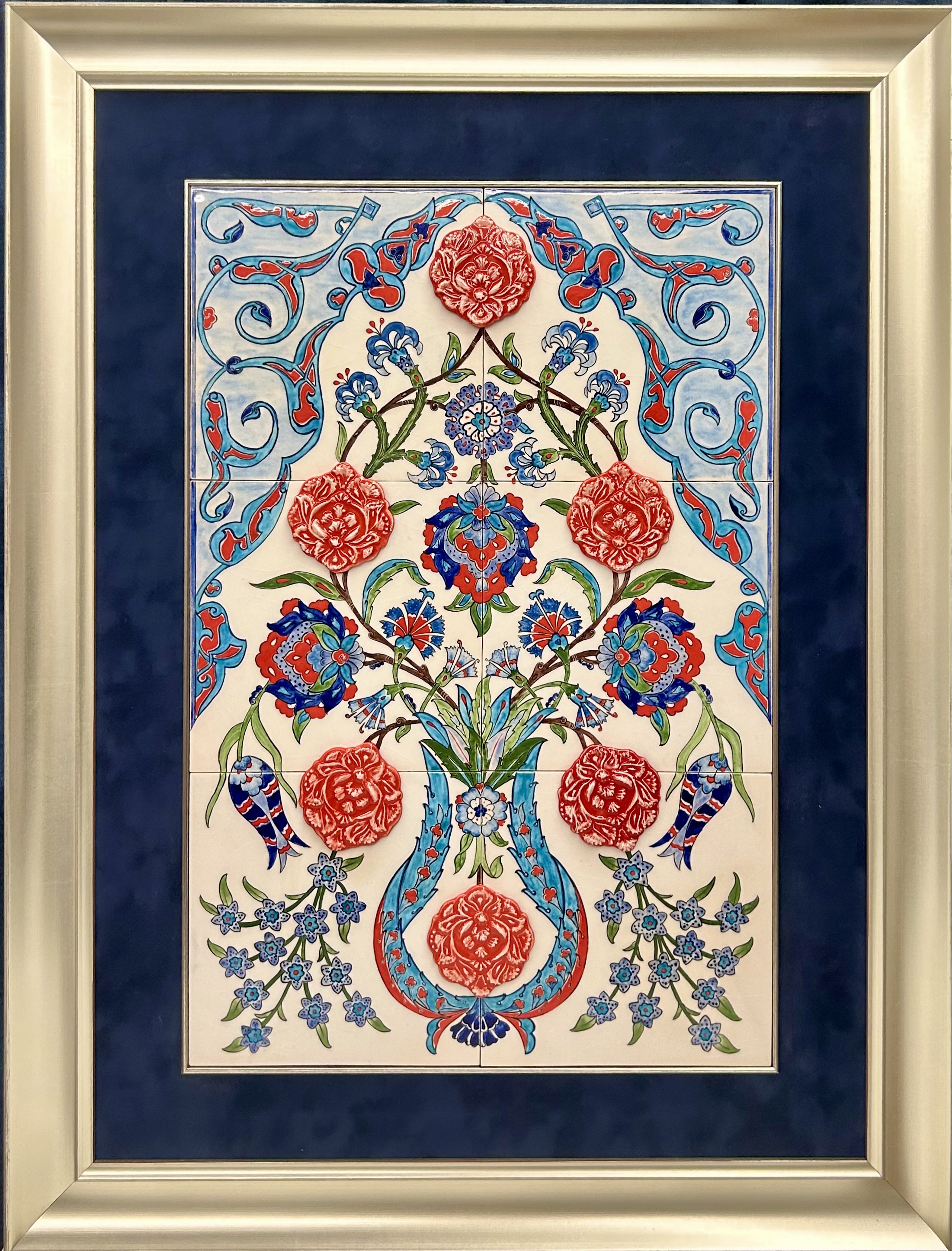 Some of the flowers are hand-shaped from ceramic clay, creating a tactile relief surface and a strong sense of material presence. This dimensional quality brings the work beyond representation, allowing form to exist physically as well as visually.