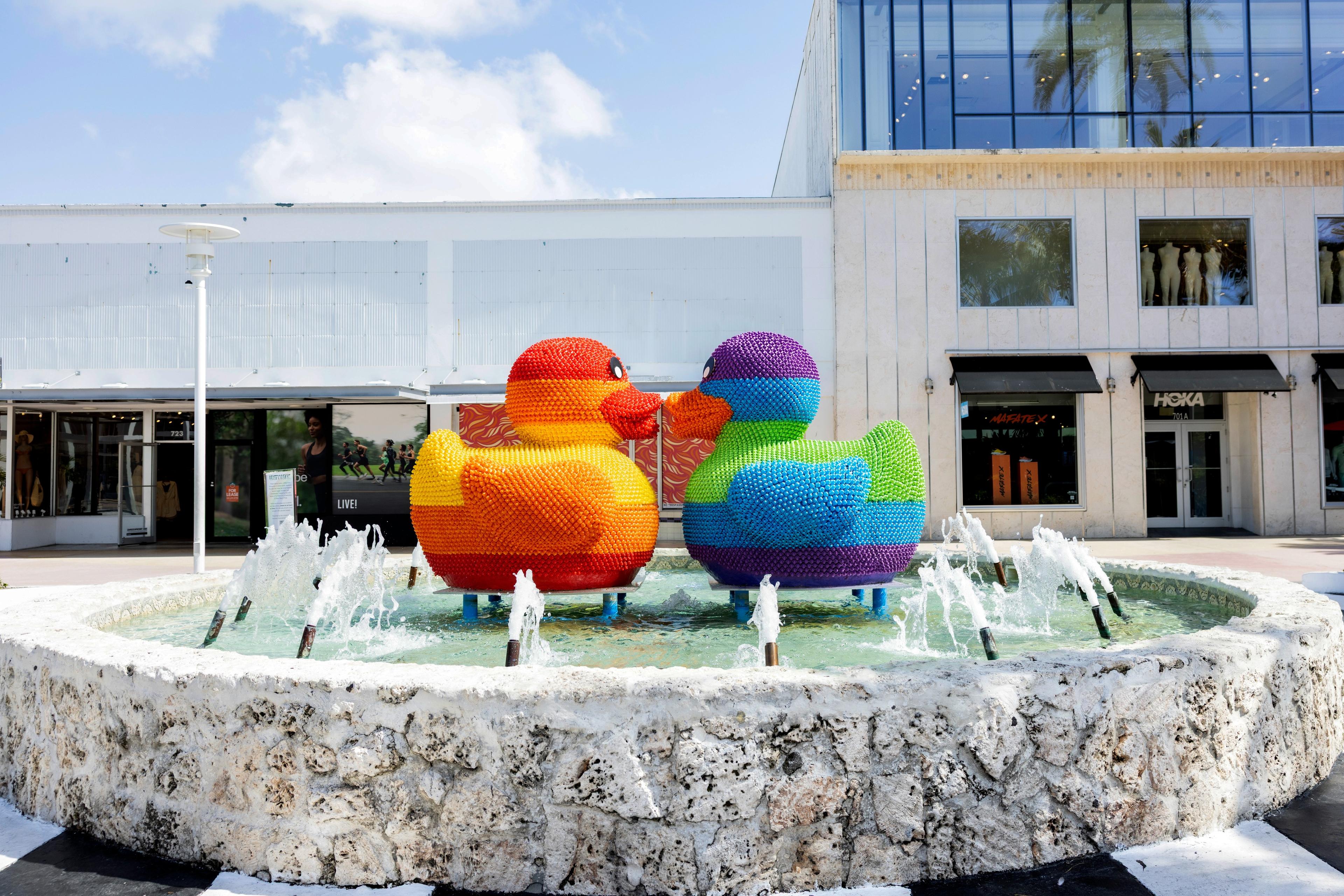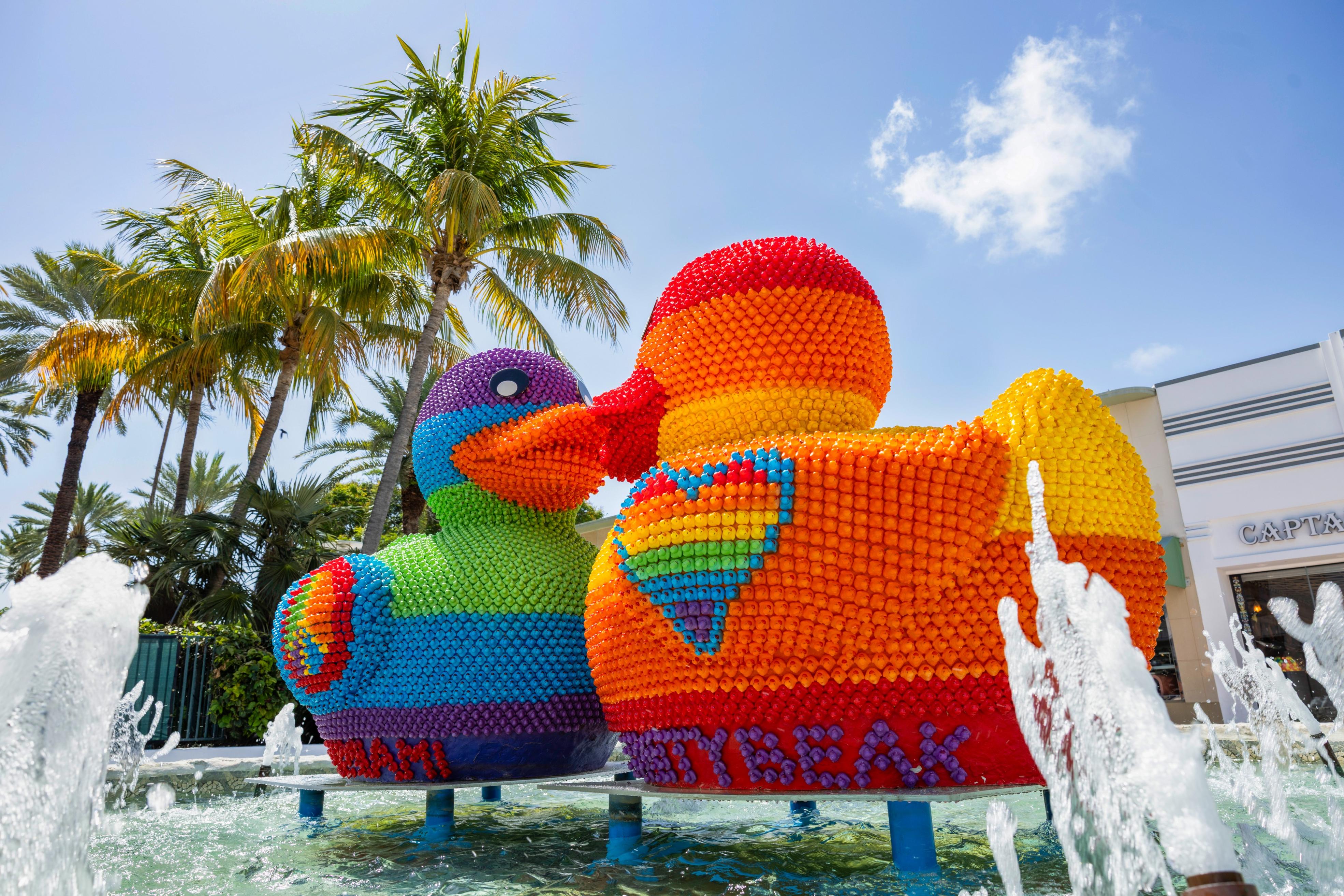 Two giant ducks kissing, each created with over 7,000 colorful mini rubber ducks. Their names are Hope, who carries a... Read More