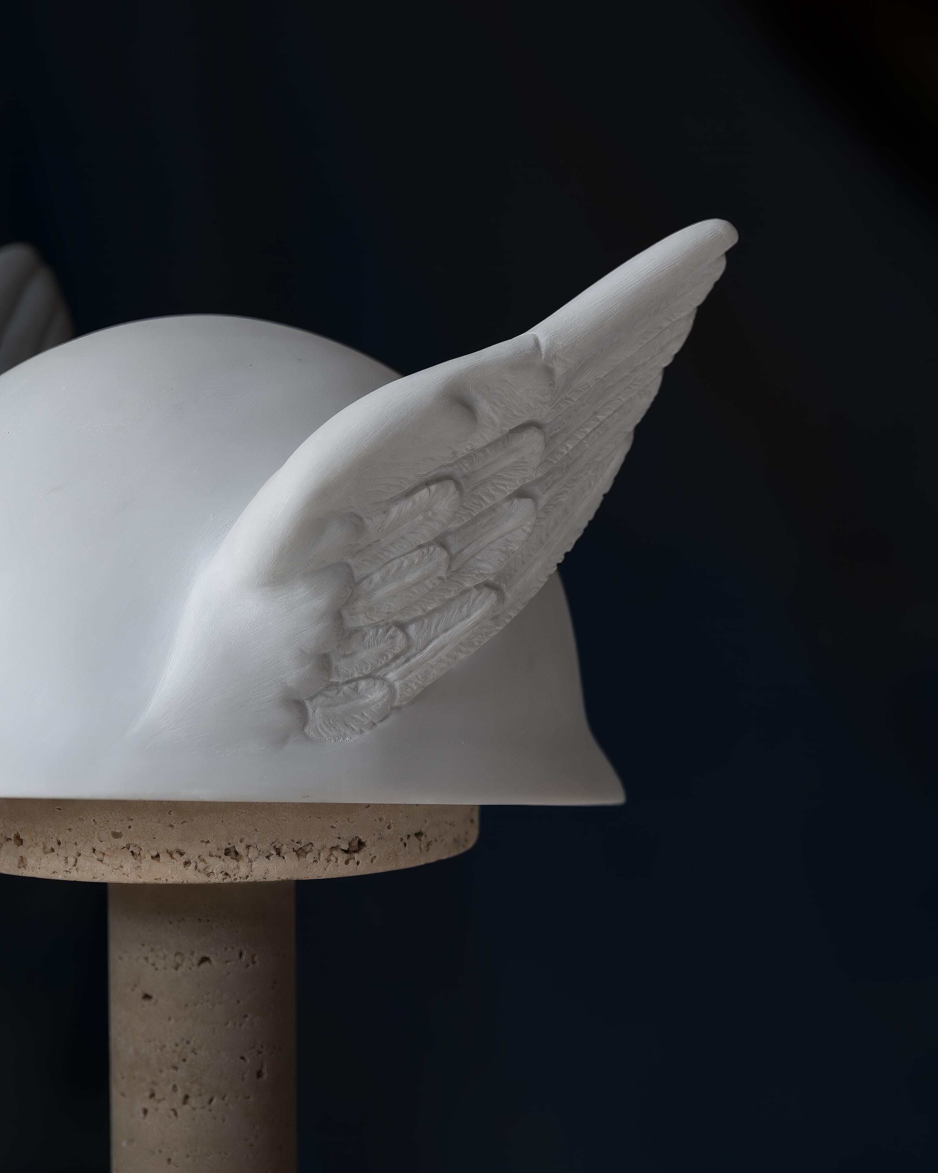 Il copricapo alato di Hermes, messaggero degli dei, ponte tra i mondi, protettore dei viaggiatori è realizzato in marmo bianco e posato su un supporto in travertino che evoca la forma essenziale di un portacappello.