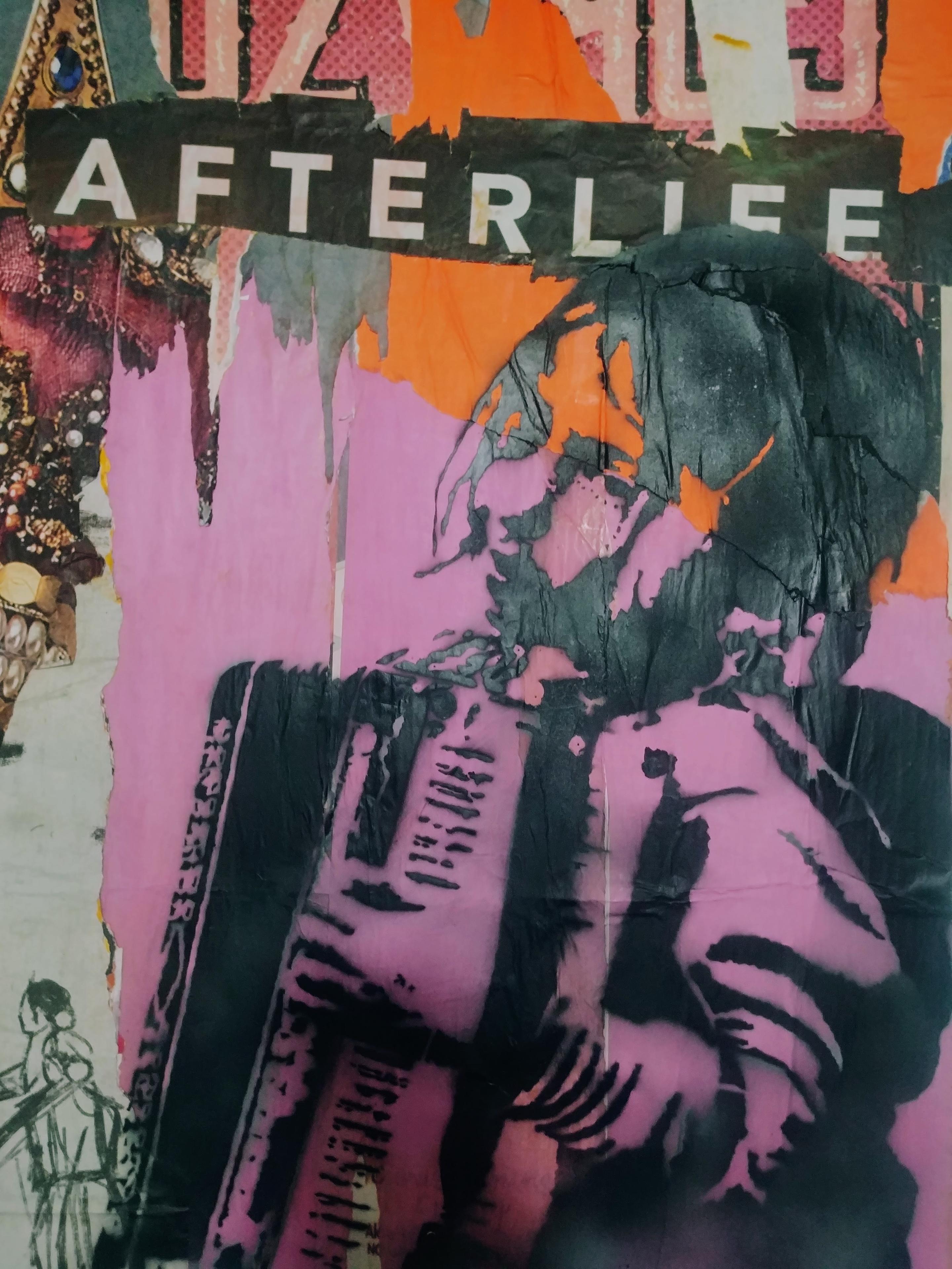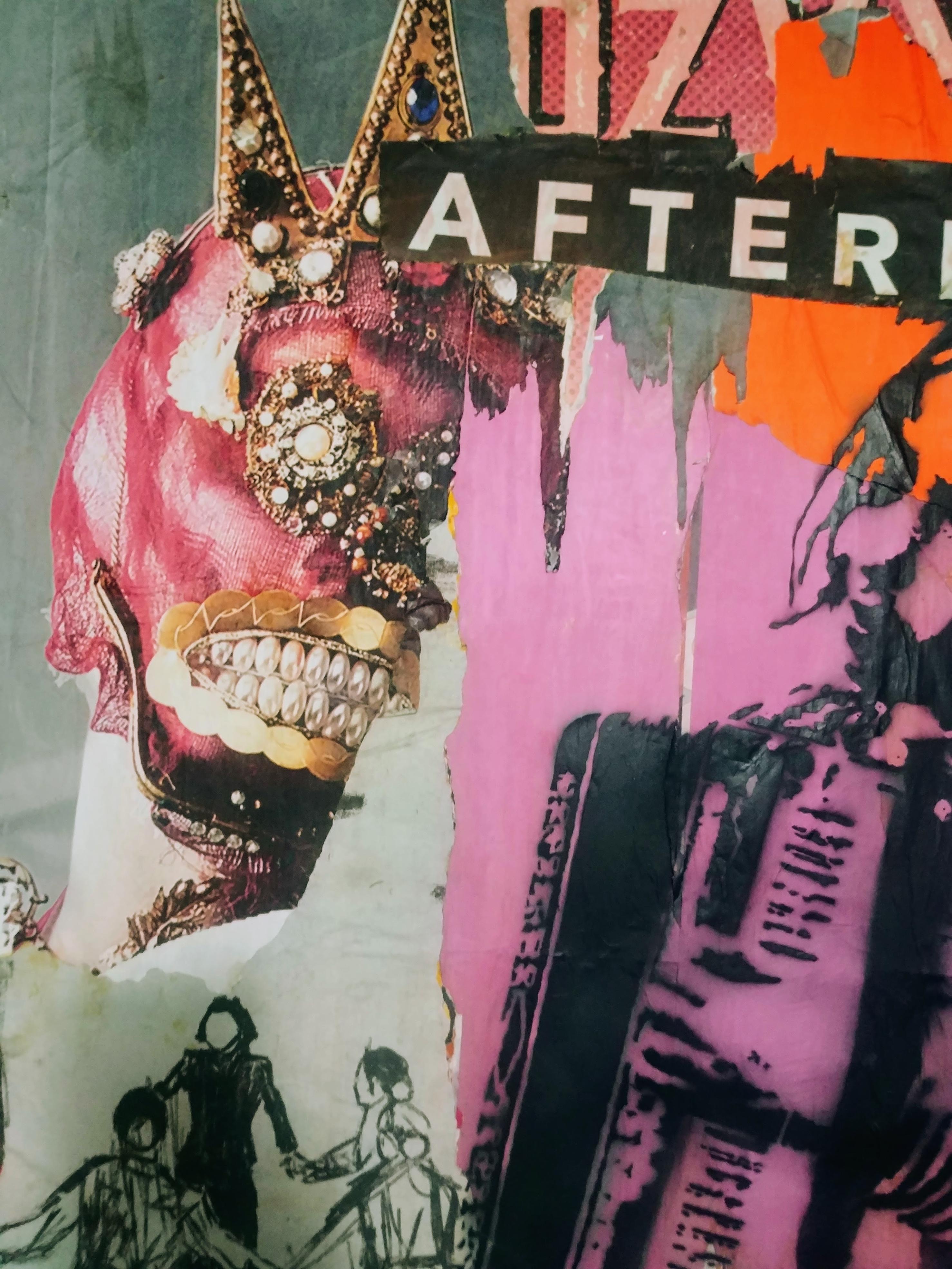 The painting employs a mixed-media approach, combining street posters, graffiti, and wallpaper to create a dynamic and textured visual field. AfterLife Corazon,... Read More