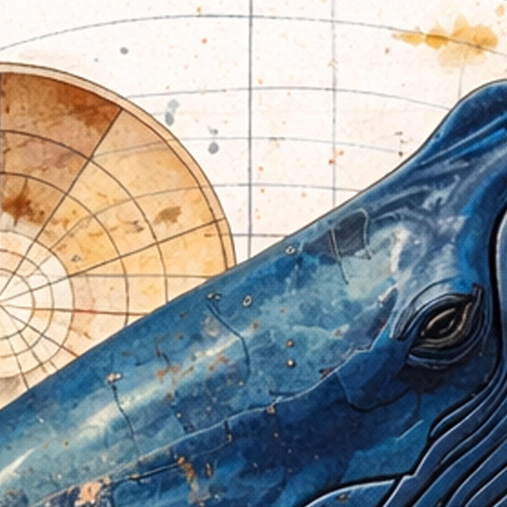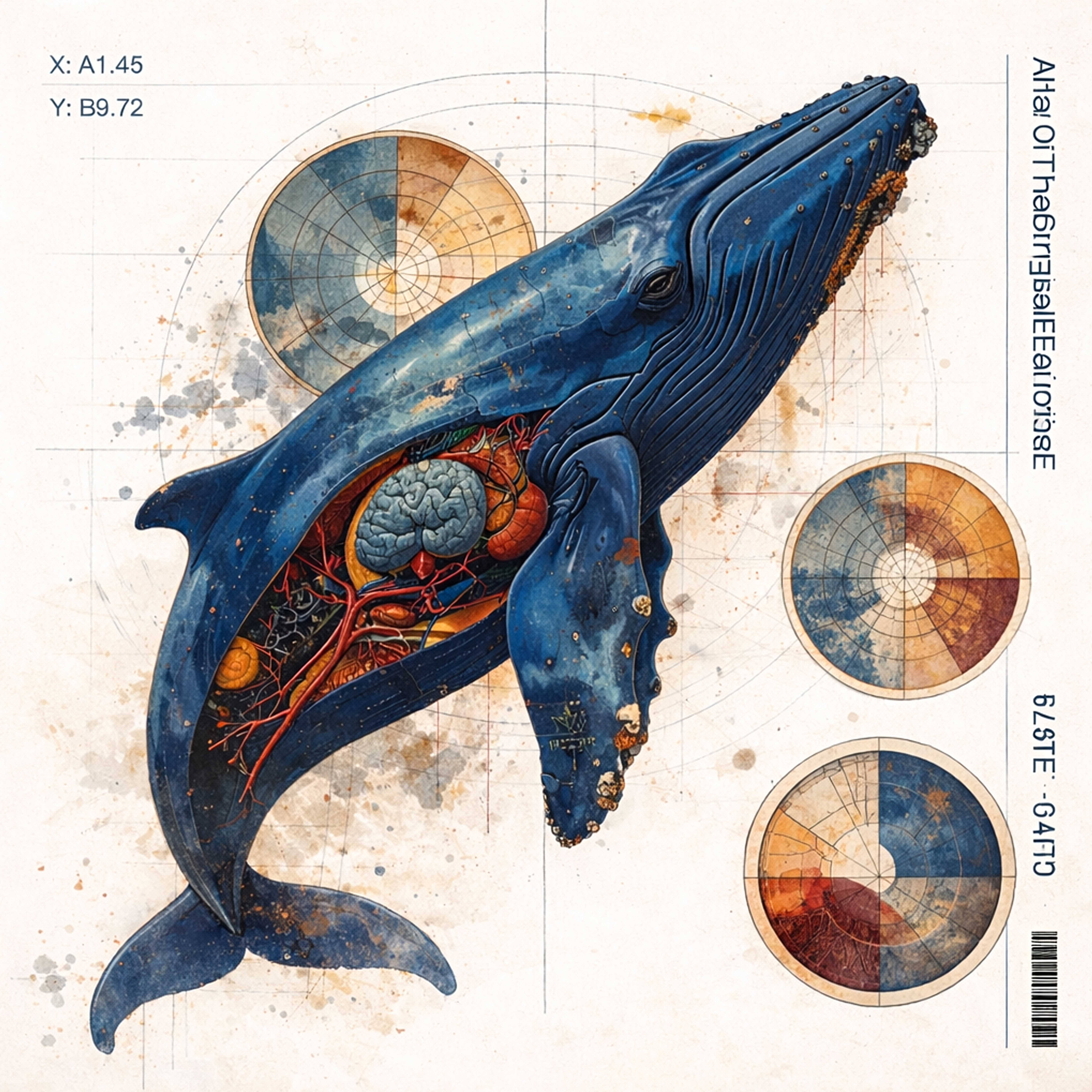 The image combines painterly elements with a controlled scientific layout: grids, coordinates, and diagrammatic marks coexist with organic textures and internal anatomy. The result is a tension between precision and error, where the organism is no longer represented as it is, but as it is understood by an external, non-human observer.