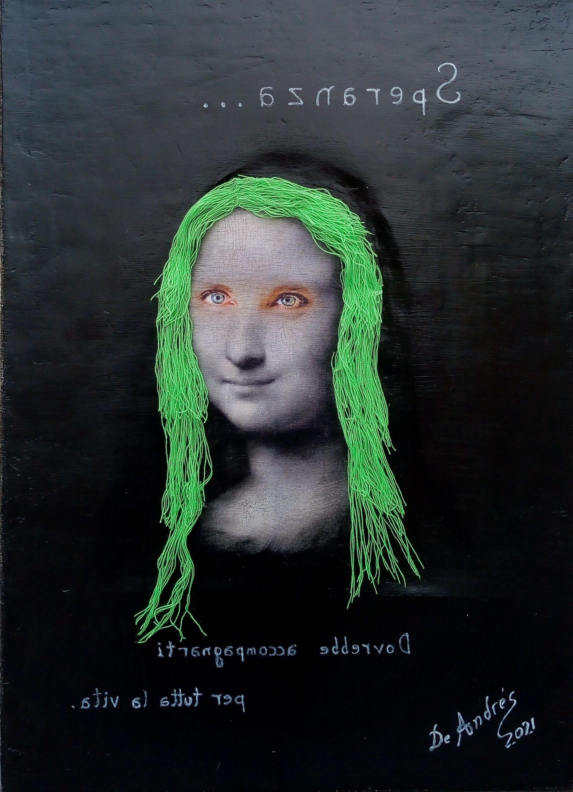 Apropiación en la Obra de Leonardo da Vinci. Técnica Mixta: Arte Digital, Acrílico y Textil sobre arpillera.