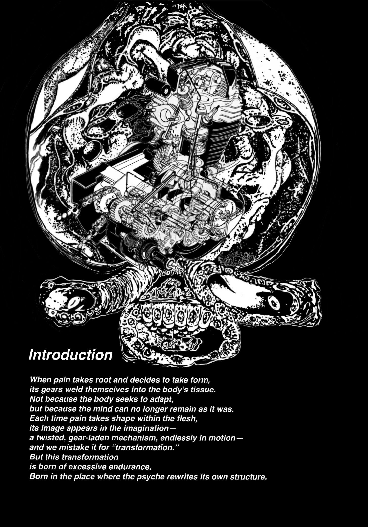 An experimental artist book exploring the morphology of pain through hybrid visual languages — combining scientific diagrams, biological forms, and poetic text. The work reimagines pain as a material entity, tracing its crystallization into new internal landscapes and symbolic anatomies.