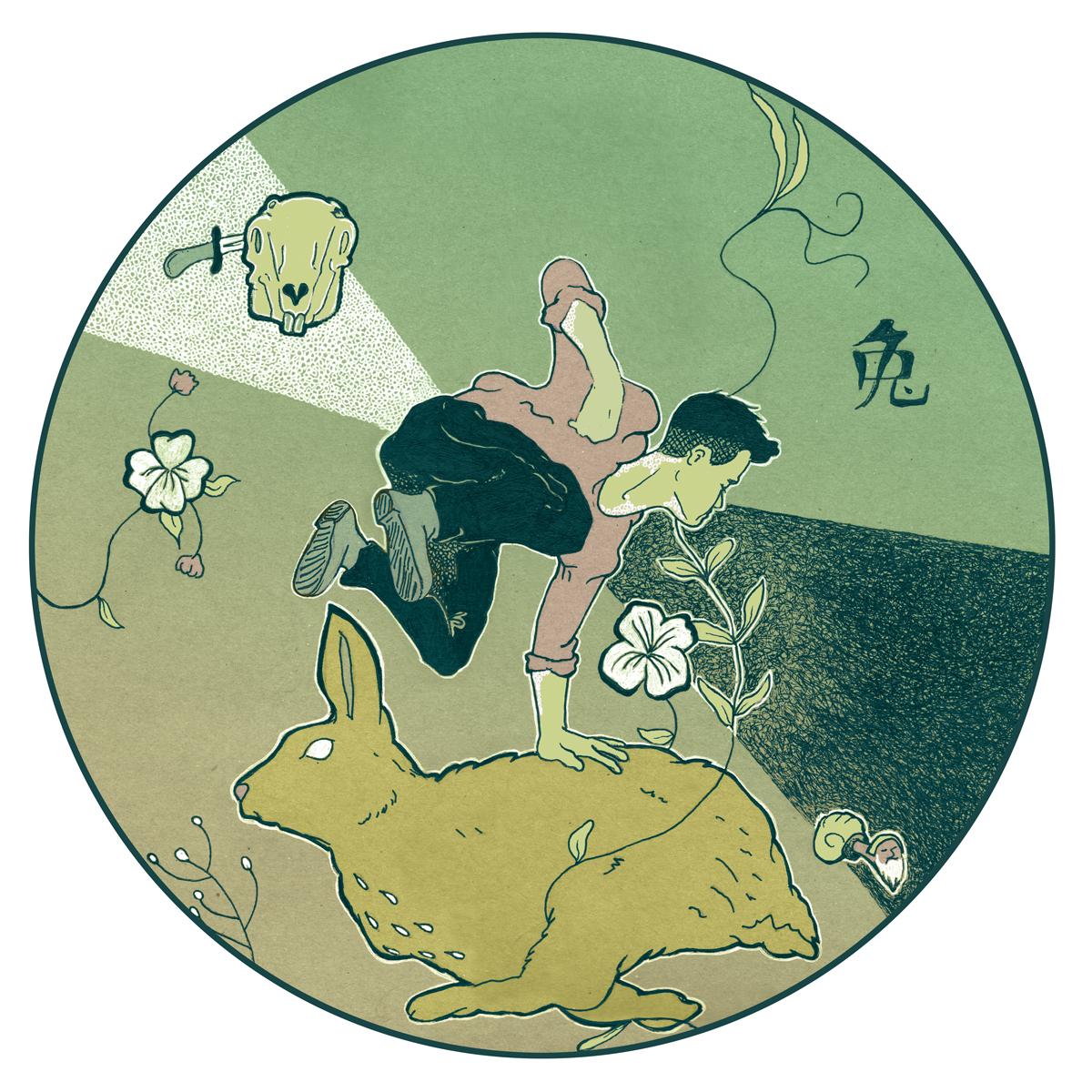 Springtime energy, leaping boy, racing rabbit. Pen and Ink on cardstock, digital coloring. Printed on fabric. Sealed in resin with texture and frame.